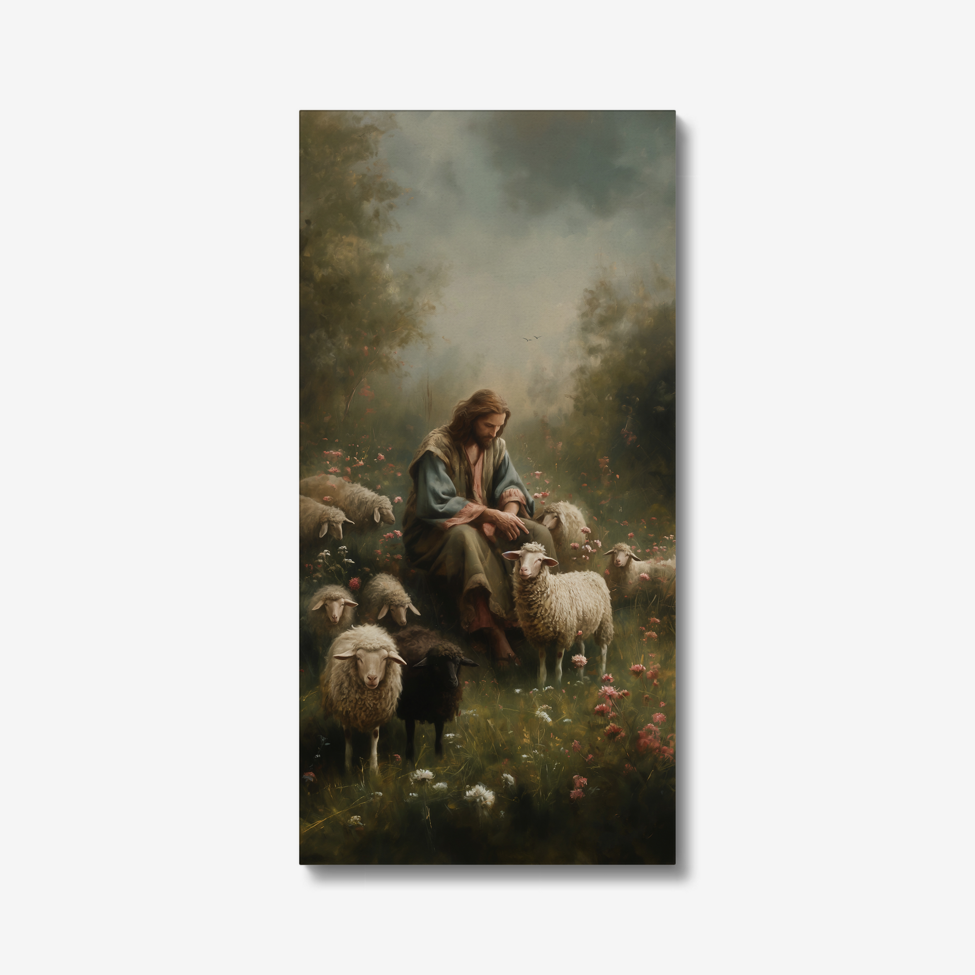 In this piece, Christ sits quietly among the sheep in a field of flowers—a tender reminder that He is always near. With infinite patience and love, He watches over us as we journey through life, even in the moments when our choices may bring Him sorrow. He never leaves, never turns away, but waits with open arms, ready to guide us the moment we turn to Him. His presence is constant, gentle, and unwavering—a steadfast Shepherd who longs to lead us safely home.